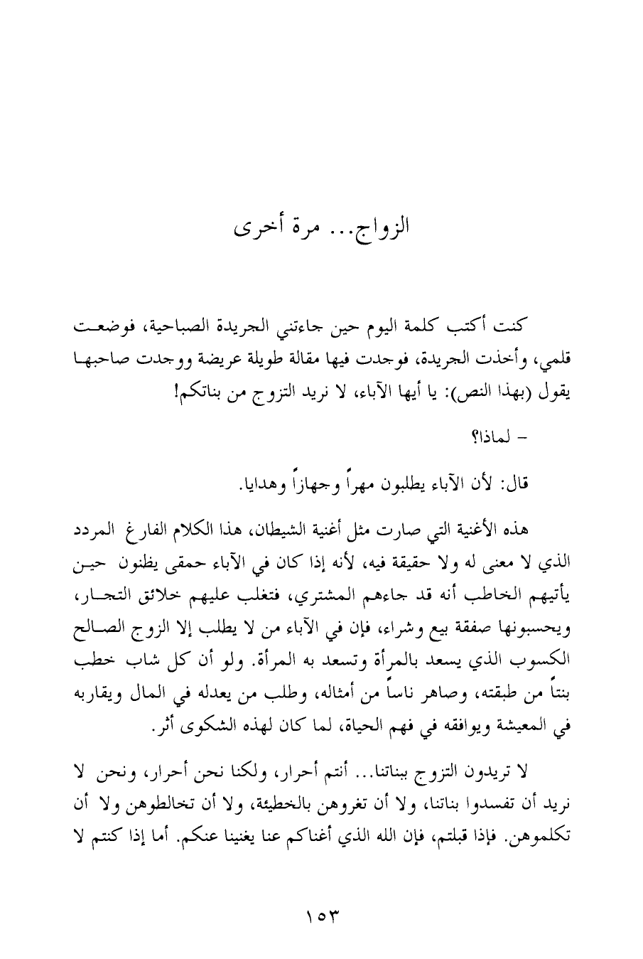كنت أكتب كلمة اليوم حين جاءتني الجريدة الصباحية، فوضعت قلمي، وأخذت الجريدة، فوجدت فيها مقالة طويلة عريضة ووجدت صاحبها يقول (بهذا النص): يا أيها الآباء، لا نريد التزوج من بناتكم!