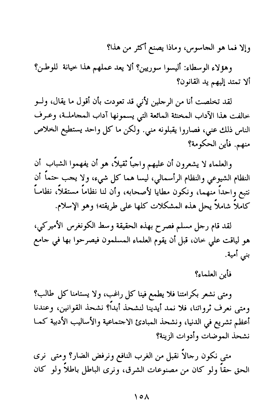 والعلماء لا يشعرون أن عليهم واجباً ثقيلاً، هو أن يفهموا الشباب أن النظام الشيوعي والنظام الرأسمالي، ليسا هما كل شيء، ولا يجب حتماً أن نتبع واحداً منهما، ونكون مطايا لأصحابه، وأن لنا نظاماً مستقلاً، نظاماً كاملاً شاملاً يحل هذه المشكلات كلها على طريقته؛ وهو الإسلام.