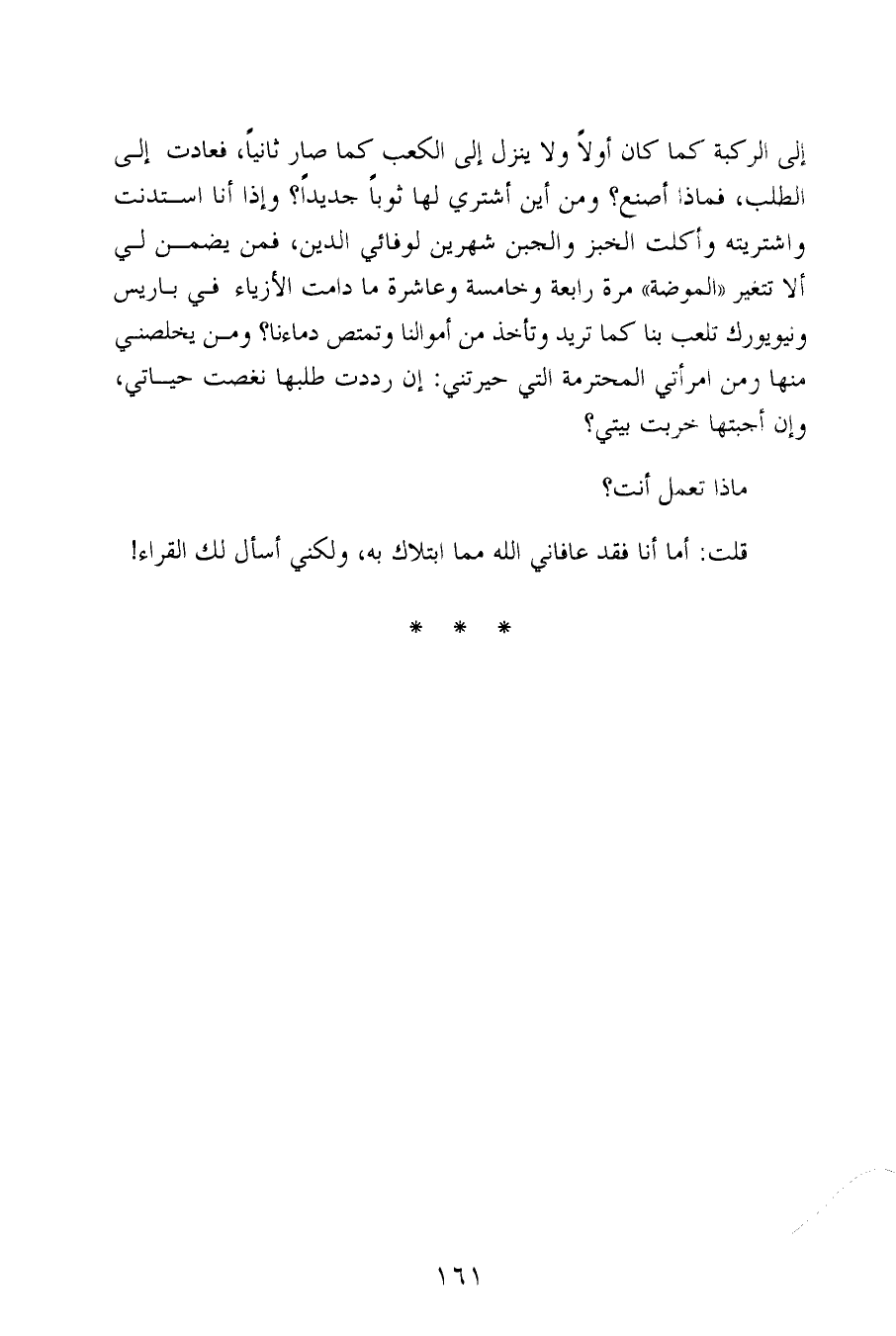 إلى الركبة كما كان أولاً ولا ينزل إلى الكعب كما صار ثانياً، فعادت إلى الطلب، فماذا أصنع؟ ومن أين أشتري لها ثوباً جديداً؟ وإذا أنا استدنت واشتريته وأكلت الخبز والجبن شهرين لوفائي الدين، فمن يضمن لي ألا تتغير «الموضة» مرة رابعة وخامسة وعاشرة ما دامت الأزياء في باريس ونيويورك تلعب بنا كما تريد وتأخذ من أموالنا وتمتص دماءنا؟ ومن يخلصني منها ومن امرأتي المحترمة التي حيرتني: إن رددت طلبها نغصت حياتي، وإن أجبتها خربت بيتي؟