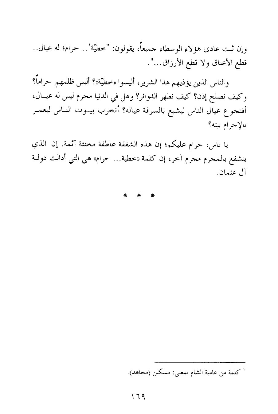 يا ناس، حرام عليكم؛ إن هذه الشفقة عاطفة مخنثة آثمة. إن الذي يتشفع بالمجرم مجرم آخر، إن كلمة «خطية ... حرام» هي التي أدالت دولة آل عثمان.