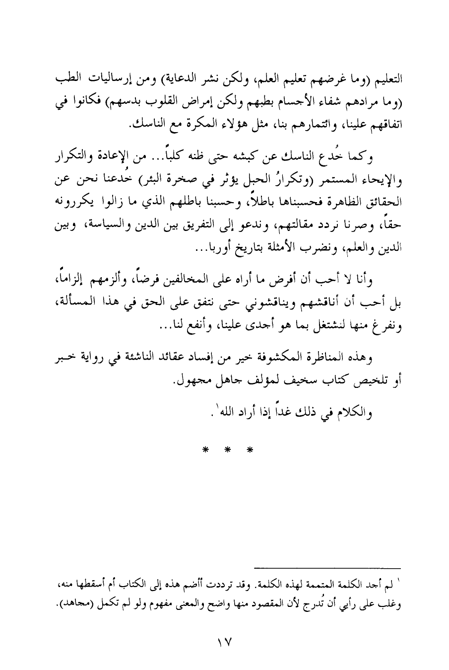 وهذه المناظرة المكشوفة خير من إفساد عقائد الناشئة في رواية خبر أو تلخيص كتاب سخيفة لمؤلف جاهل مجهول.