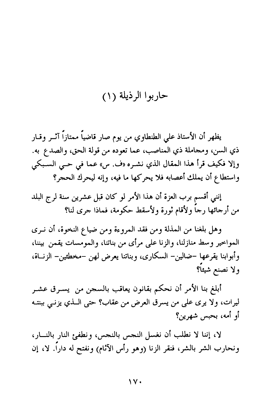 لا، إننا لا نطلب أن نغسل النجس بالنجس، ونطفئ النار بالنار، ونحارب الشر بالشر، فنقر الزنا (وهو رأس الآثام) ونفتح له داراً. لا، إن