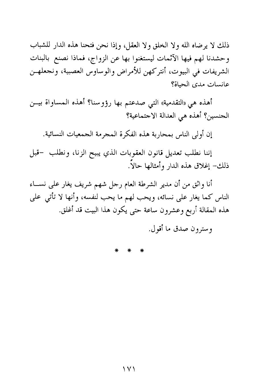 أنا واثق من أن مدير الشرطة العام رجل شهم شريف يغار على نساء الناس كما يغار على نسائه، ويحب لهم ما يحب لنفسه، وأنها لا تأتي على هذه المقالة أربع وعشرون ساعة حتى يكون هذا البيت قد أغلق.