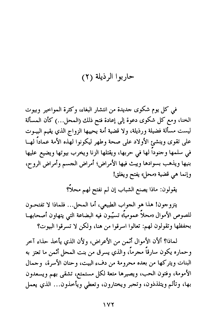 في كل يوم شكوى جديدة من انتشار البغاء، وكثرة المواخير وبيوت الخنا، ومع كل شكوى دعوة إلى إعادة فتح ذلك (المحل ...) كأن المسألة ليست مسألة فضيلة ورذيلة، ولا قضية أمة يحييها الزواج الذي يقيم البيوت على تقوى وينشئ الأولاد على صحة وطهر ليكونوا لهذه الأمة عماداً لها في سلمها وجنوداً لها في حربها، ويقتلها الزنا ويخرب بيوتها ويضيع عليها بنيها ويذهب بسوادها ويبث فيها الأمراض؛ أمراض الجسم وأمراض الروح، وإنما هي قضية «محل» يفتح ويغلق!