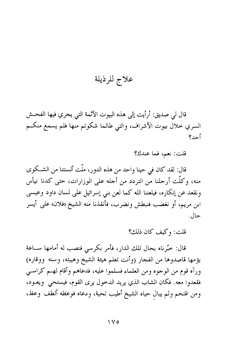 قال: لقد كان في حينا واحد من هذه الدور، ملّت ألسنتنا من الشكوى منه، وكلّت أرجلنا من التردد من أجله على الوزارات، حتى كدنا نيأس ونقعد عن إنكاره، فيلعننا الله كما لعن بني إسرائيل على لسان داود وعيسى ابن مريم، أو نغضب فنبطش ونضرب، فأنقذنا منه الشيخ «فلان» على أيسر حال.