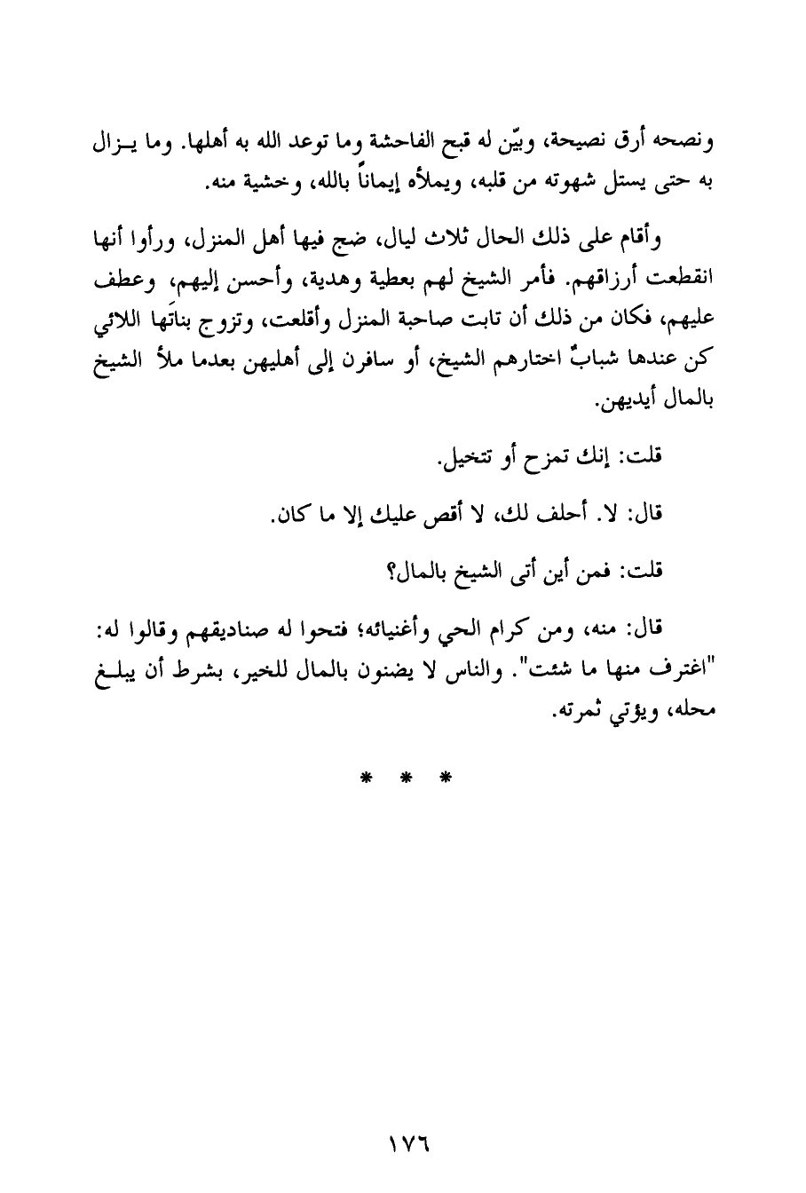 وأقام على ذلك الحال ثلاث ليال، ضج فيها أهل المنزل، ورأوا أنها انقطعت أرزاقهم. فأمر الشيخ لهم بعطية وهدية، وأحسن إليهم، وعطف عليهم، فكان من ذلك أن تابت صاحبة المنزل وأقلعت، وتزوج بناتها اللائي كن عندها شبابٌ اختارهم الشيخ، أو سافرن إلى أهليهن بعدما ملأ الشيخ بالمال أيديهن.