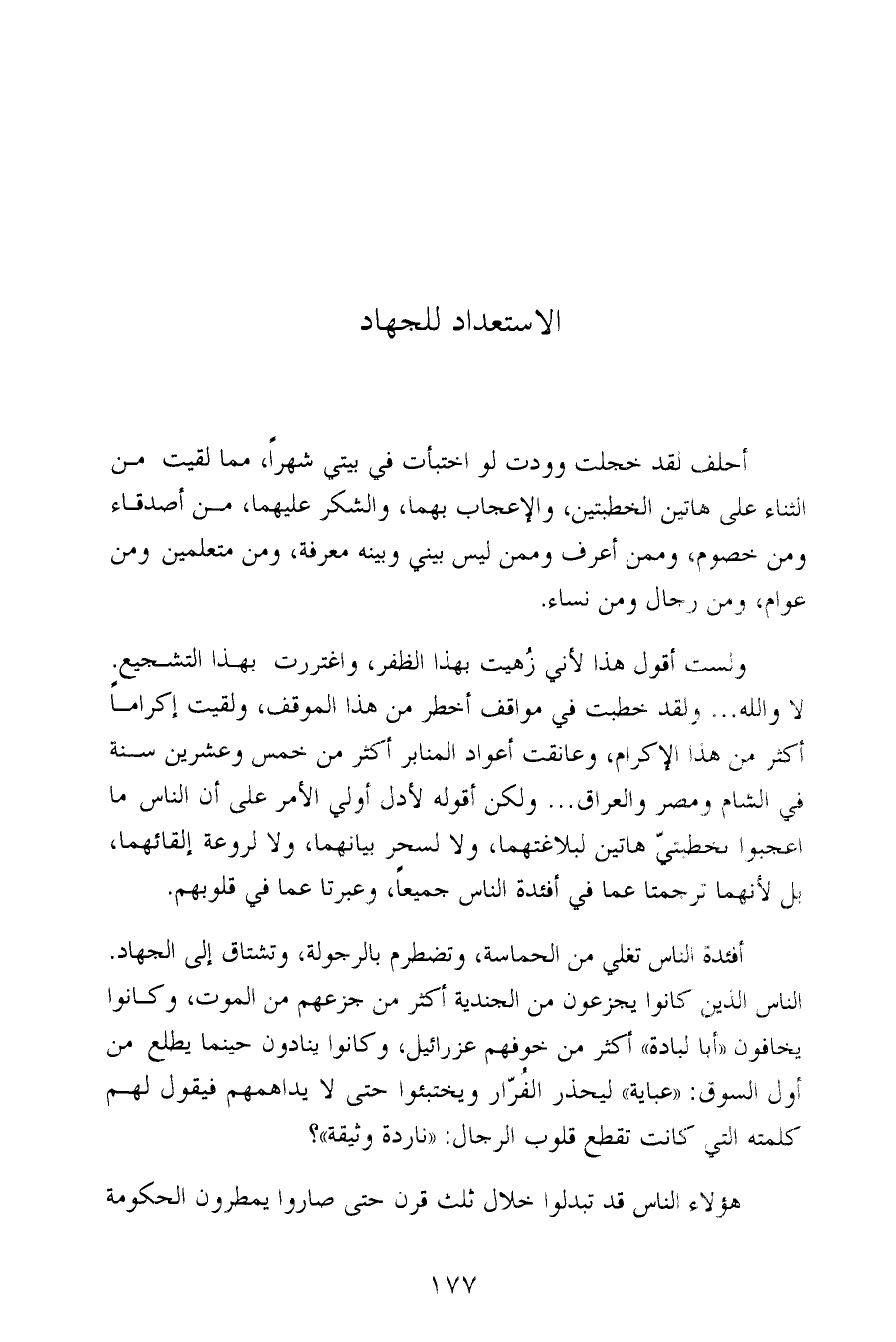 أفئدة الناس تغلي من الحماسة، وتضطرم بالرجولة، وتشتاق إلى الجهاد. الناس الذين كانوا يجزعون من الجندية أكثر من جزعهم من الموت، وكانوا يخافون «أبا لبادة» أكثر من خوفهم عزرائيل، وكانوا ينادون حينما يطلع من أول السوق: «عباية» ليحذر الفُرّار ويختبئوا حتى لا يداهمهم فيقول لهم كلمته التي كانت تقطع قلوب الرجال: «ناردة وثيقة»؟