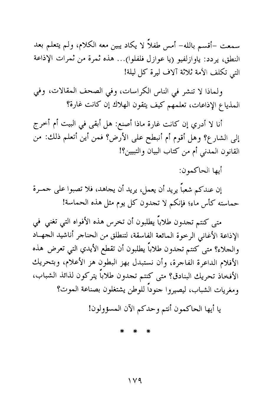سمعت -أقسم بالله- أمس طفلاً لا يكاد يبين معه الكلام، ولم يتعلم بعد النطق، يردد: ياوازلفيو (يا عوازل فلفلوا) ... هذه ثمرة من ثمرات الإذاعة التي تكلف الأمة ثلاثة آلاف ليرة كل ليلة!