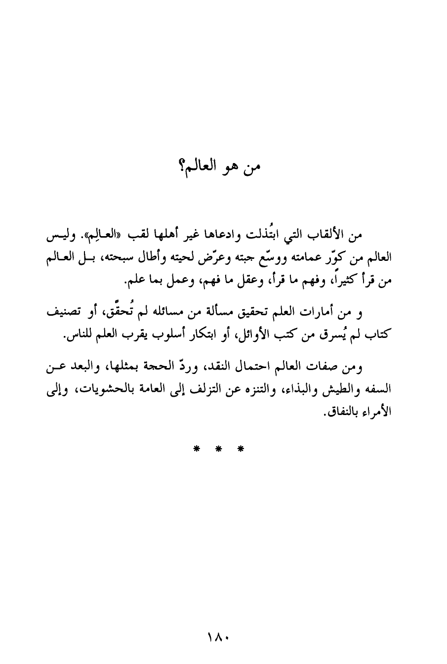 من الألقاب التي ابتُذلت وادعاها غير أهلها لقب «العالِم». وليس العالم من كوّر عمامته ووسّع جبته وعرّض لحيته وأطال سبحته، بل العالم من قرأ كثيراً، وفهم ما قرأ، وعقل ما فهم، وعمل بما علم.