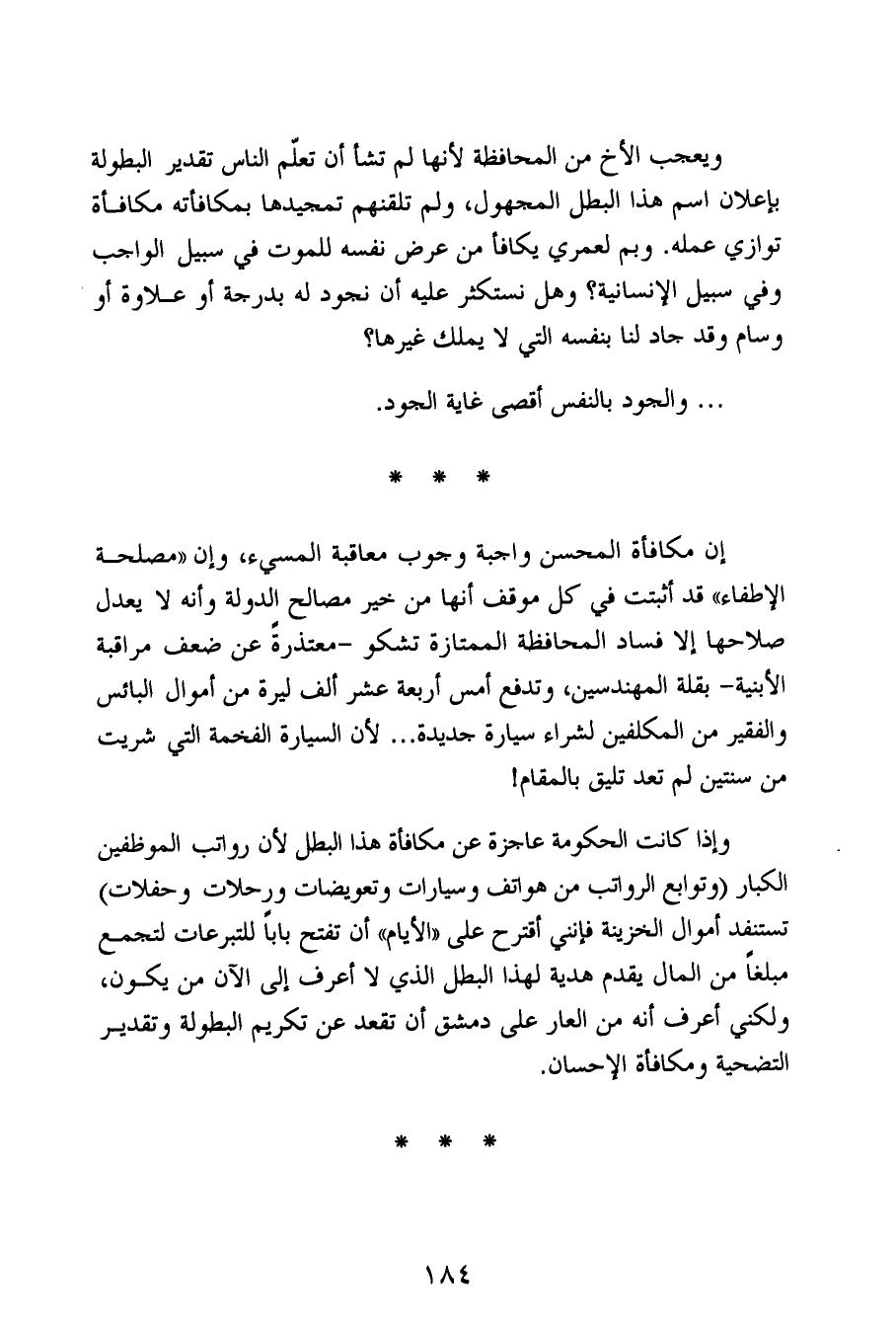 ويعجب الأخ من المحافظة لأنها لم تشأ أن تعلّم الناس تقدير البطولة بإعلان اسم هذا البطل المجهول، ولم تلقنهم تمجيدها بمكافأته مكافأة توازي عمله. وبم لعمري يكافأ من عرض نفسه للموت في سبيل الواجب وفي سبيل الإنسانية؟ وهل نستكثر عليه أن نجود له بدرجة أو علاوة أو وسام وقد جاد لنا بنفسه التي لا يملك غيرها؟