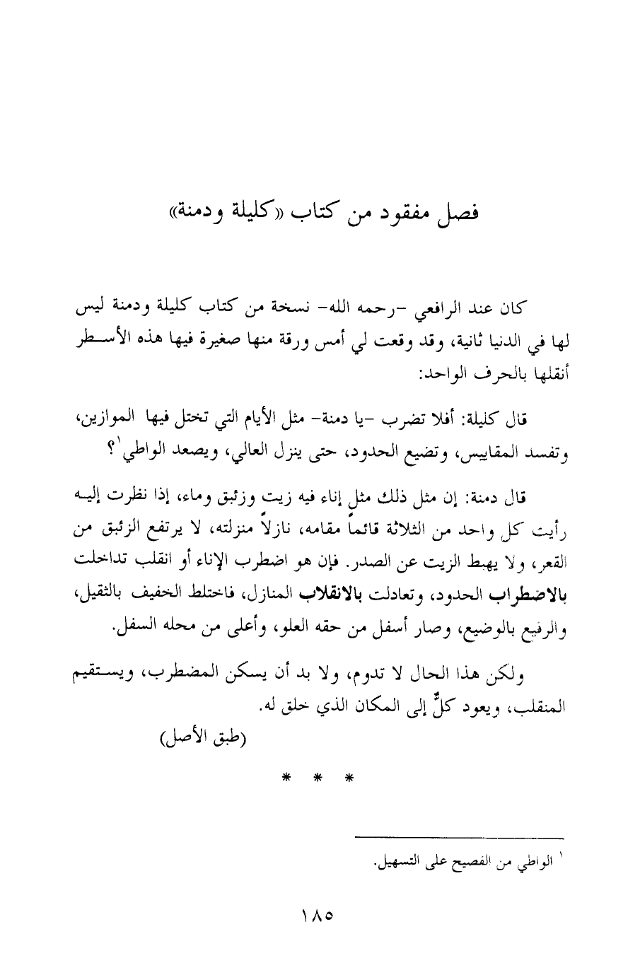 كان عند الرافعي -رحمه الله- نسخة من كتاب كليلة ودمنة ليس لها في الدنيا ثانية، وقد وقعت لي أمس ورقة منها صغيرة فيها هذه الأسطر أنقلها بالحرف الواحد: