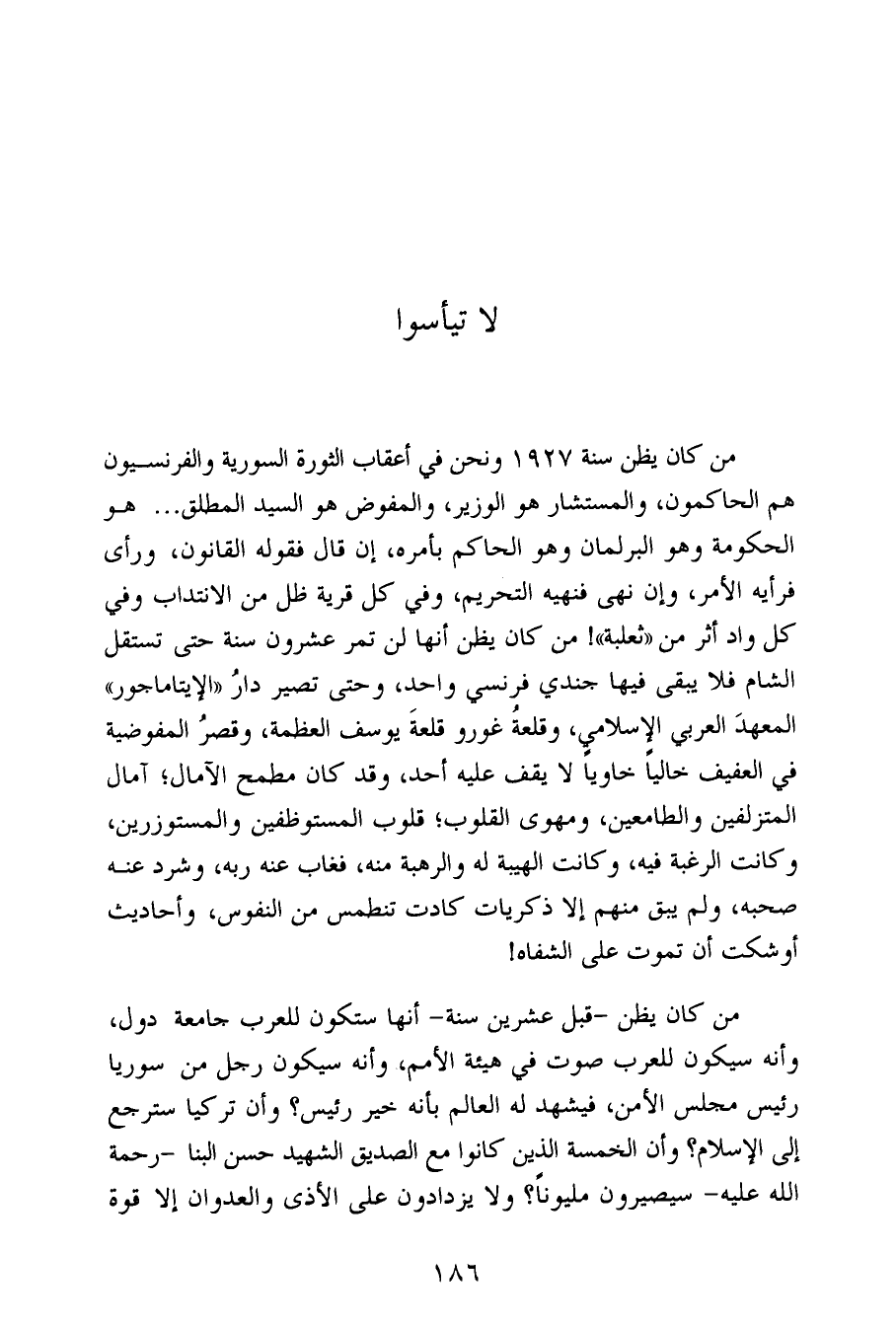 من كان يظن سنة 1927 ونحن في أعقاب الثورة السورية والفرنسيون هم الحاكمون، والمستشار هو الوزير، والمفوض هو السيد المطلق ... هو الحكومة وهو البرلمان وهو الحاكم بأمره، إن قال فقوله القانون، ورأى فرأيه الأمر، وإن نهى فنهيه التحريم، وفي كل قرية ظل من الانتداب وفي كل واد أثر من «ثعلبة»! من كان يظن أنها لن تمر عشرون سنة حتى تستقل الشام فلا يبقى فيها جندي فرنسي واحد، وحتى تصير دارُ «الإيتاماجور» المعهدَ العربي الإسلامي، وقلعةُ غورو قلعةَ يوسف العظمة، وقصرُ المفوضية في العفيف خالياً خاوياً لا يقف عليه أحد، وقد كان مطمح الآمال؛ آمال المتزلفين والطامعين، ومهوى القلوب؛ قلوب المستوظفين والمستوزرين، وكانت الرغبة فيه، وكانت الهيبة له والرهبة منه، فغاب عنه ربه، وشرد عنه صحبه، ولم يبق منهم إلا ذكريات كادت تنطمس من النفوس، وأحاديث أوشكت أن تموت على الشفاه!