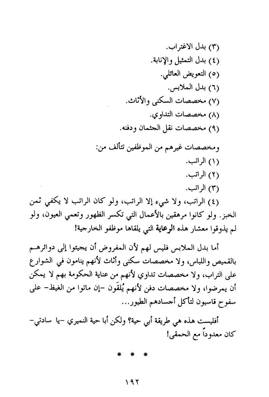 أما بدل الملابس فليس لهم لأن المفروض أن يجيئوا إلى دوائرهم بالقميص واللباس، ولا مخصصات سكنى وأثاث لأنهم ينامون في الشوارع على التراب، ولا مخصصات تداوي لأنهم من عناية الحكومة بهم لا يمكن أن يمرضوا، ولا مخصصات دفن لأنهم يُلقَون -إن ماتوا من الغيظ- على سفوح قاسيون لتأكل أجسادهم الطيور ...
