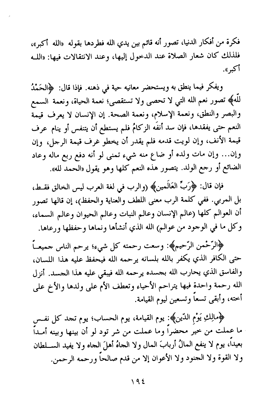 ويفكر فيما ينطق به ويستحضر معانيه حية في ذهنه. فإذا قال: {الحَمْدُ لله} تصور نعم الله التي لا تحصى ولا تستقصى؛ نعمة الحياة، ونعمة السمع والبصر والنطق، ونعمة الإسلام، ونعمة الصحة. إن الإنسان لا يعرف قيمة النعم حتى يفقدها، فإن سد أنفَه الزكامُ فلم يستطع أن يتنفس أو ينام عرف قيمة الأنف، وإن لويت قدمه فلم يقدر أن يخطو عرف قيمة الرجل، وإن وإن ... وإن مات ولده أو ضاع منه شيء تمنى لو أنه دفع ربع ماله وعاد الضائع أو رجع الولد. يتصور هذه النعم كلها وهو يقول «الحمد لله».
