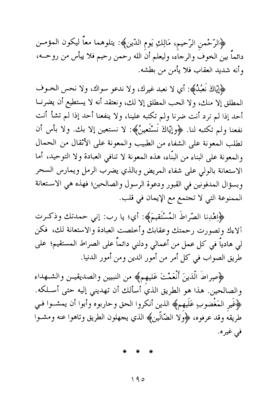 {الرّحْمنِ الرّحيمِ، مَالِكِ يَومِ الدّين}: يتلوهما معاً ليكون المؤمن دائماً بين الخوف والرجاء، وليعلم أن الله رحمن رحيم فلا ييأس من روحه، وأنه شديد العقاب فلا يأمن من بطشه.