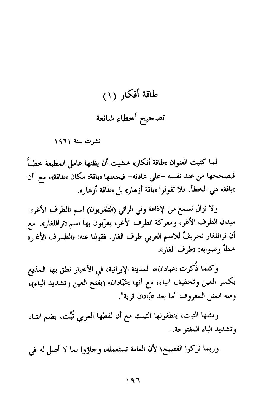 لما كتبت العنوان «طاقة أفكار» خشيت أن يظنها عامل المطبعة خطأً فيصححها من عند نفسه -على عادته- فيجعلها «باقة» مكان «طاقة»، مع أن «باقة» هي الخطأ. فلا تقولوا «باقة أزهار» بل «طاقة أزهار».