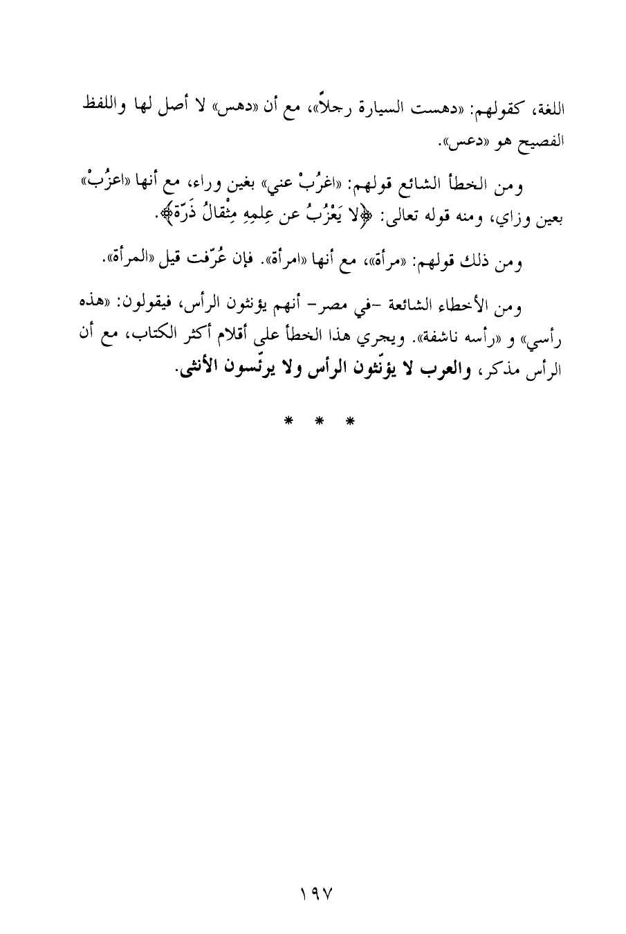 ومن الأخطاء الشائعة -في مصر- أنهم يؤنثون الرأس، فيقولون: «هذه رأسي» و «رأسه ناشفة». ويجري هذا الخطأ على أقلام أكثر الكتاب، مع أن الرأس مذكر، والعرب لا يؤنّثون الرأس ولا يرئّسون الأنثى.