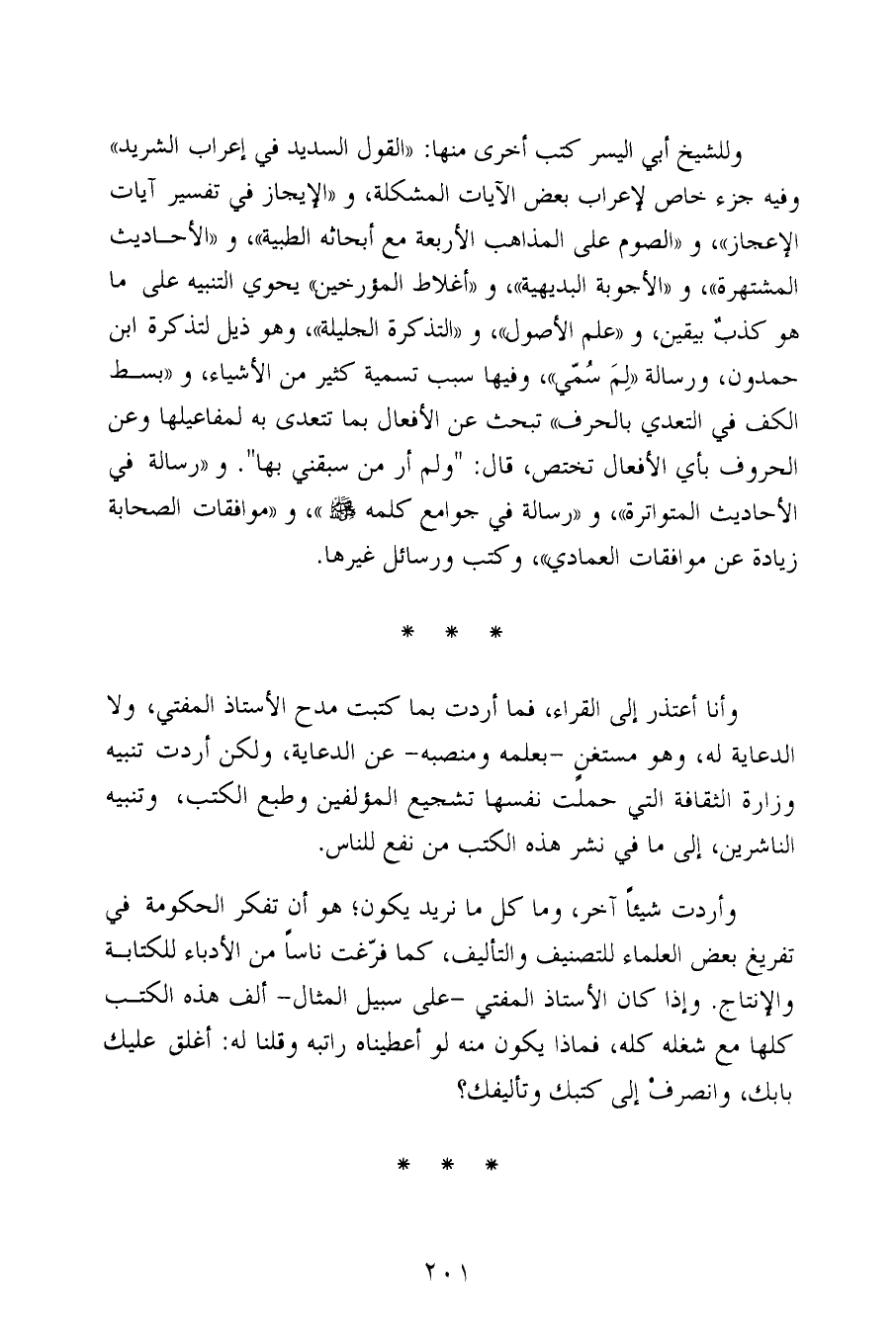 وأنا أعتذر إلى القراء، فما أردت بما كتبت مدح الأستاذ المفتي، ولا الدعاية له، وهو مستغنٍ -بعلمه ومنصبه- عن الدعاية، ولكن أردت تنبيه وزارة الثقافة التي حملت نفسها تشجيع المؤلفين وطبع الكتب، وتنبيه الناشرين، إلى ما في نشر هذه الكتب من نفع للناس.
