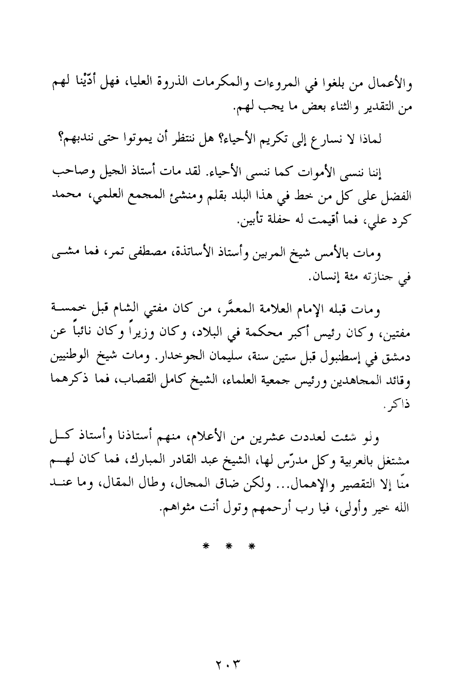 ولو شئت لعددت عشرين من الأعلام، منهم أستاذنا وأستاذ كل مشتغل بالعربية وكل مدرّس لها، الشيخ عبد القادر المبارك، فما كان لهم منّا إلا التقصير والإهمال ... ولكن ضاق المجال، وطال المقال، وما عند الله خير وأولى، فيا رب أرحمهم وتول أنت مثواهم.