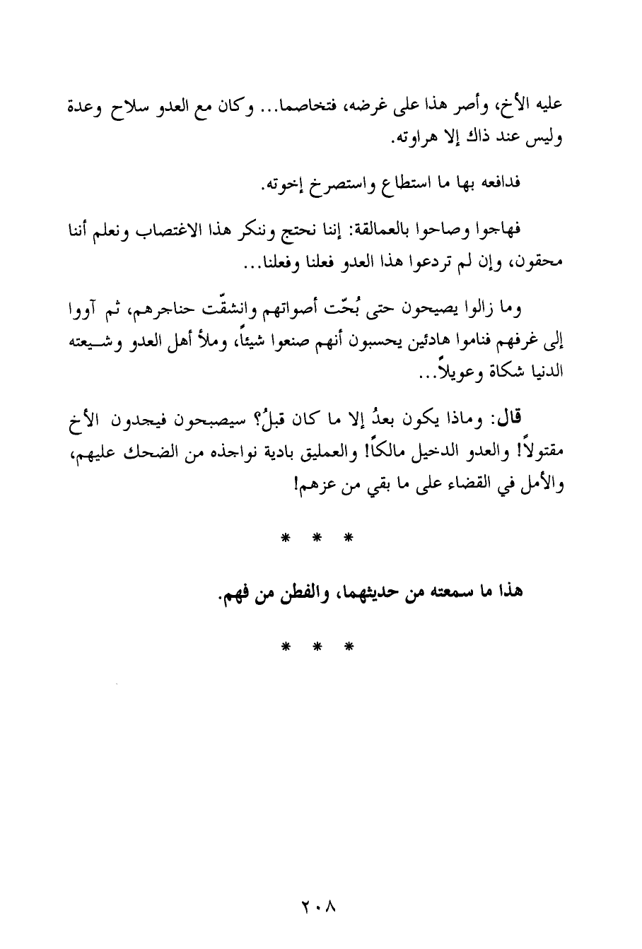قال: وماذا يكون بعدُ إلا ما كان قبلُ؟ سيصبحون فيجدون الأخ مقتولاً! والعدو الدخيل مالكاً! والعمليق بادية نواجذه من الضحك عليهم، والأمل في القضاء على ما بقي من عزهم!