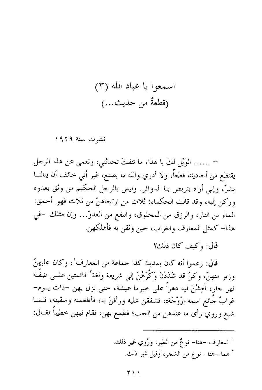 - ...... الوَيْل لكَ يا هذا، ما تنفكّ تحدثني، وتعمى عن هذا الرجل يقتطع من أحاديثنا قطعاً، ولا أدري والله ما يصنع، غير أني خائف أن ينالنا بشرّ، وإني أراه يتربص بنا الدوائر. وليس بالرجل الحكيم من وثق بعدوه وركن إليه، وقد قالت الحكماء: ثلاث من ارتجاهنّ من ثلاث فهو أحمق: الماء من النار، والرزق من المخلوق، والنفع من العدوّ ... وإن مثلك -في هذا- كمثل المعارف والغراب، حين وثقن به فأهلكهن.