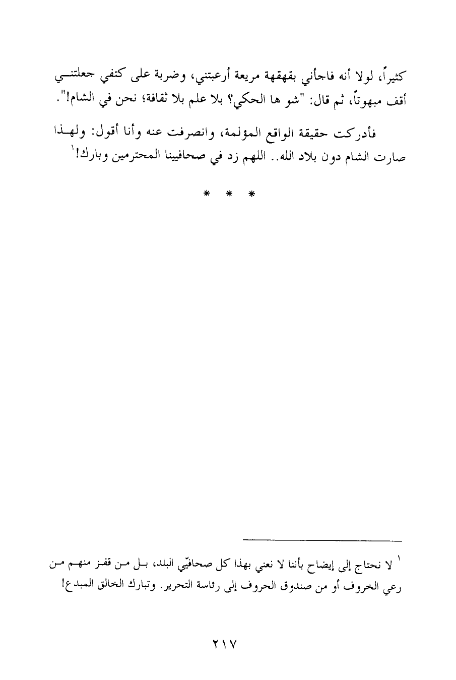 فأدركت حقيقة الواقع المؤلمة، وانصرفت عنه وأنا أقول: ولهذا صارت الشام دون بلاد الله .. اللهم زد في صحافيينا المحترمين وبارك! (¬1)