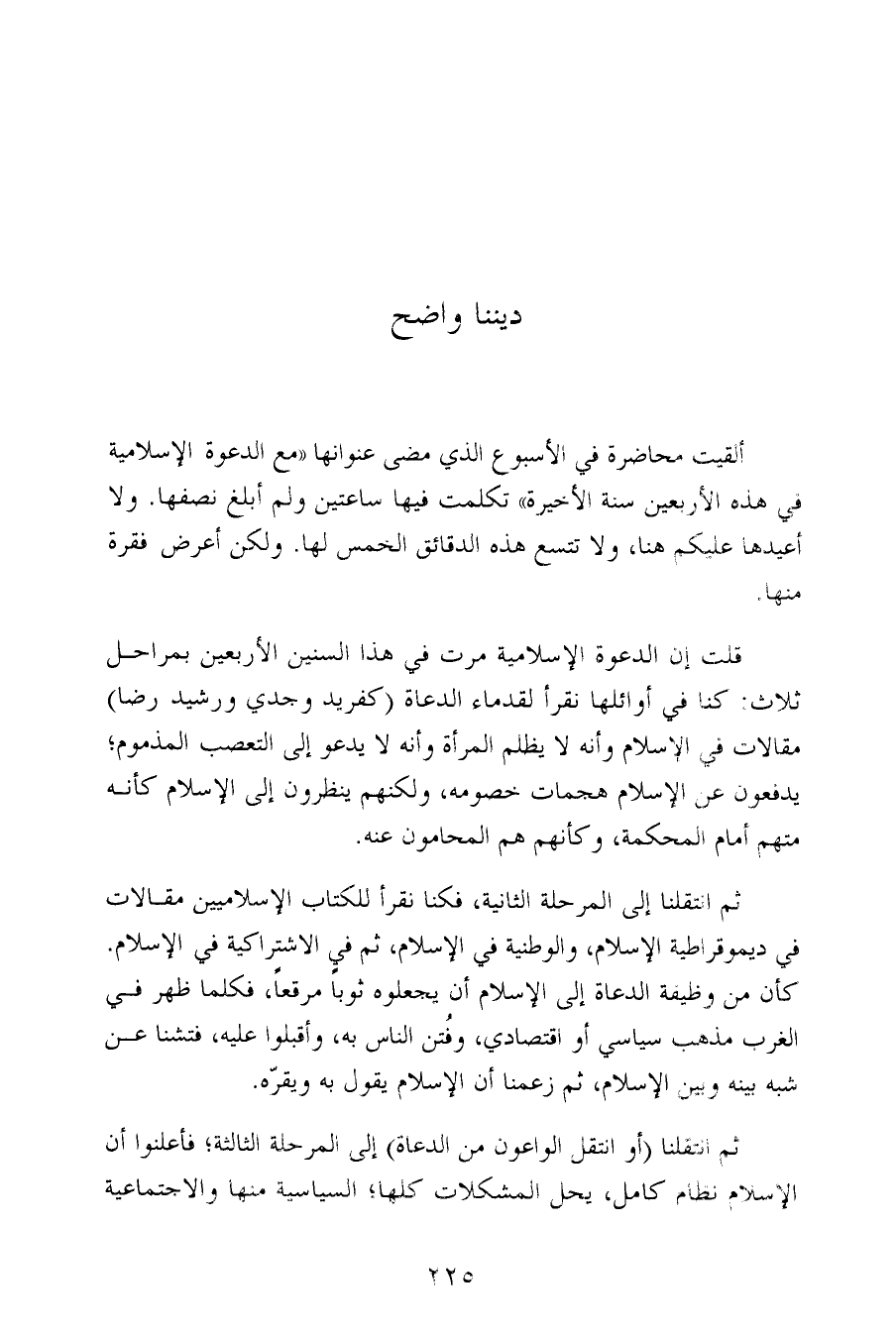 ثم انتقلنا إلى المرحلة الثانية، فكنا نقرأ للكتاب الإسلاميين مقالات في ديموقراطية الإسلام، والوطنية في الإسلام، ثم في الاشتراكية في الإسلام. كأن من وظيفة الدعاة إلى الإسلام أن يجعلوه ثوباً مرقعاً، فكلما ظهر في الغرب مذهب سياسي أو اقتصادي، وفُتن الناس به، وأقبلوا عليه، فتشنا عن شبه بينه وبين الإسلام، ثم زعمنا أن الإسلام يقوم به ويقرّه.