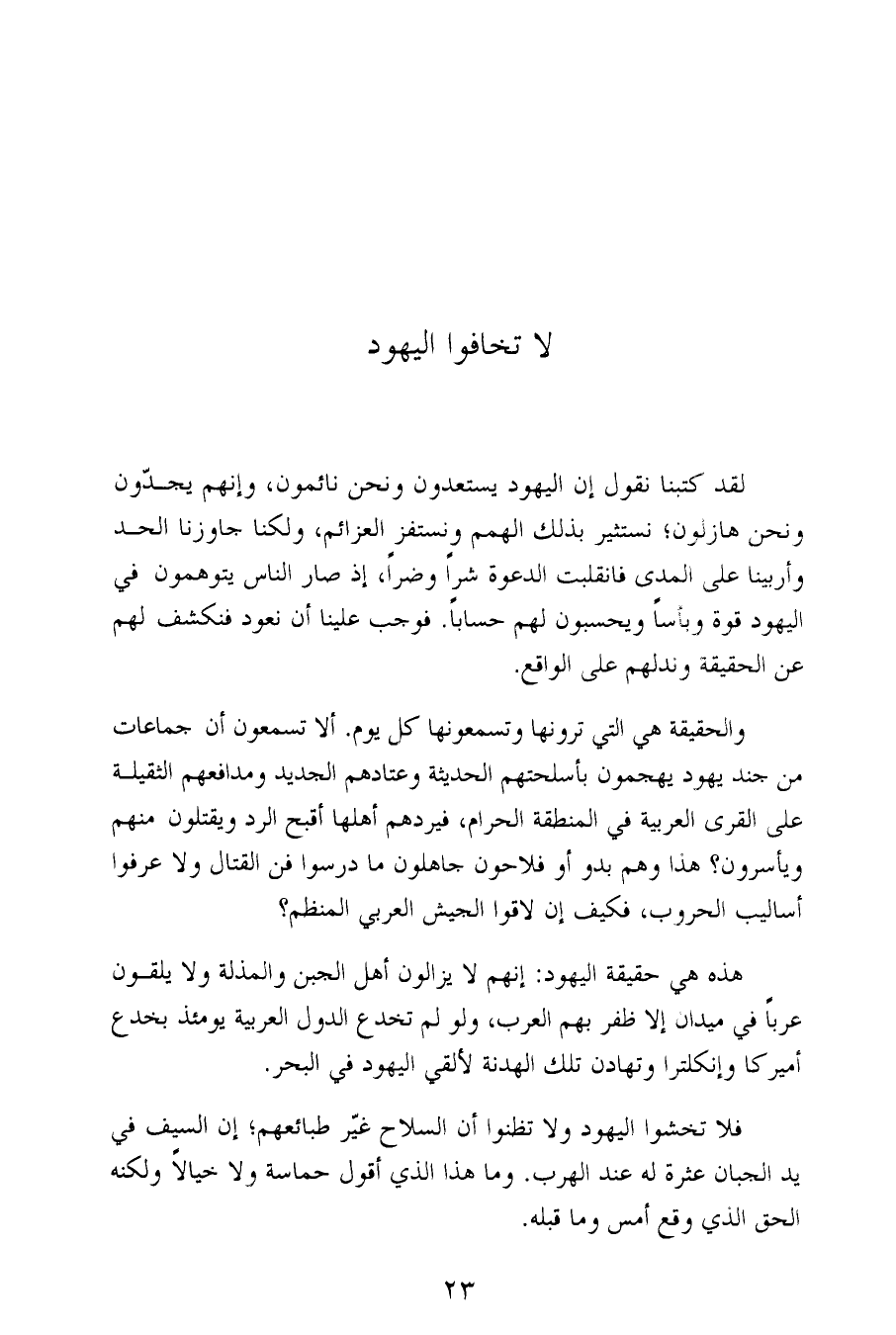فلا تخشوا اليهود ولا تظنوا أن السلاح غيّر طبائعهم؛ إن السيف في يد الجبان عثرة له عند الهرب. وما هذا الذي أقول حماسة ولا خيالاً ولكنه الحق الذي وقع أمس وما قبله.
