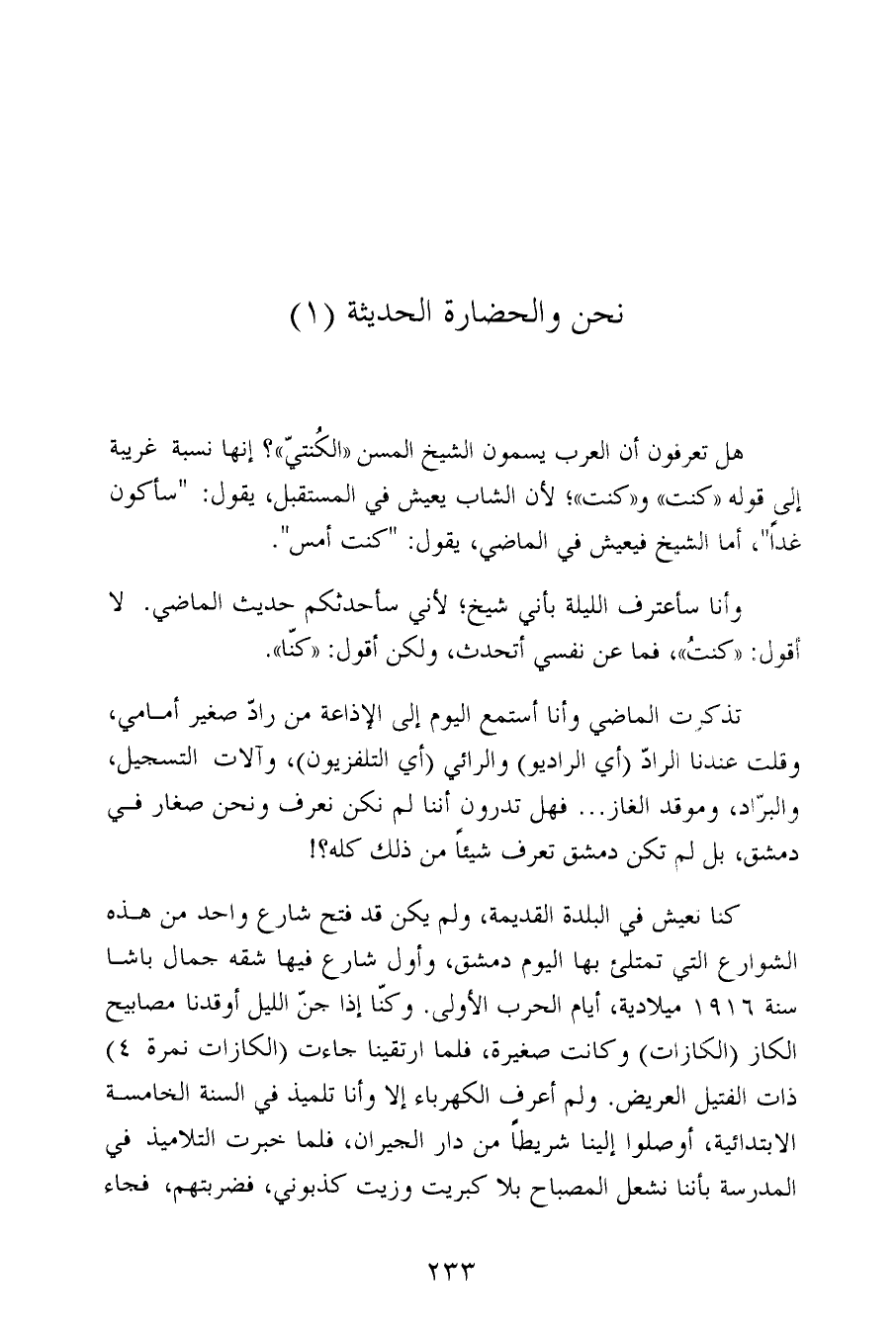 تذكرت الماضي وأنا أستمع اليوم إلى الإذاعة من رادّ صغير أمامي، وقلت عندنا الرادّ (أي الراديو) والرائي (أي التلفزيون)، وآلات التسجيل، والبرّاد، وموقد الغاز ... فهل تدرون أننا لم نكن نعرف ونحن صغار في دمشق، بل لم تكن دمشق تعرف شيئاً من ذلك كله؟!