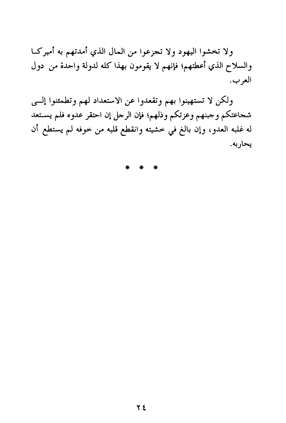 ولا تخشوا اليهود ولا تجزعوا من المال الذي أمدتهم به أميركا والسلاح الذي أعطتهم؛ فإنهم لا يقومون بهذا كله لدولة واحدة من دول العرب.