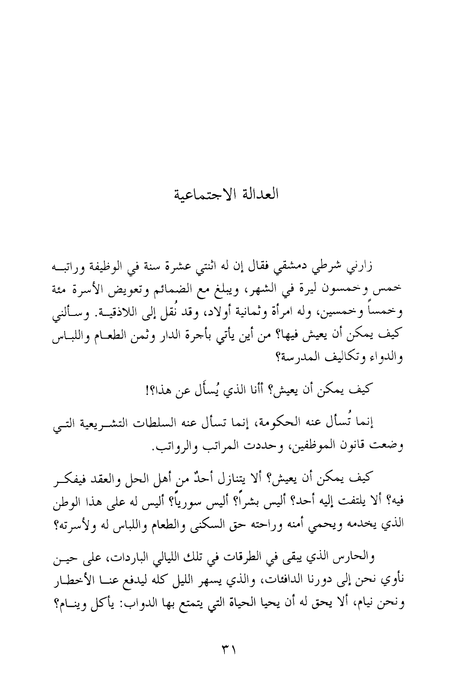 كيف يمكن أن يعيش؟ ألا يتنازل أحدٌ من أهل الحل والعقد فيفكر فيه؟ ألا يلتفت إليه أحد؟ أليس بشراً؟ أليس سورياً؟ أليس له على هذا الوطن الذي يخدمه ويحمي أمنه وراحته حق السكنى والطعام واللباس له ولأسرته؟