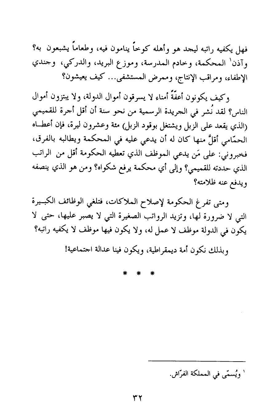 ومتى تفرغ الحكومة لإصلاح الملاكات، فتلغي الوظائف الكبيرة التي لا ضرورة لها، وتزيد الرواتب الصغيرة التي لا يصبر عليها، حتى لا يكون في الدولة موظف لا عمل له، ولا يكون فيها موظف لا يكفيه راتبه؟