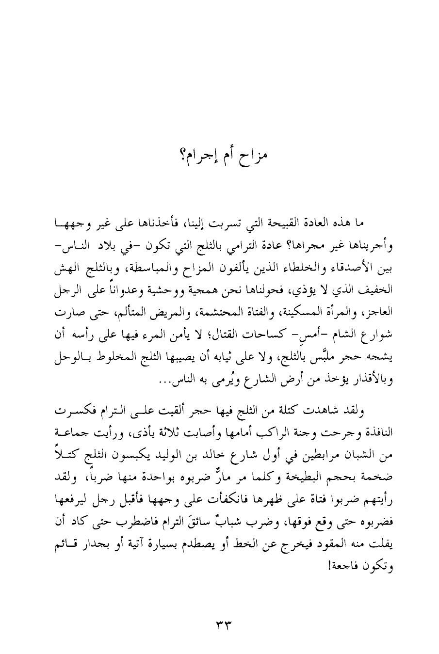 ما هذه العادة القبيحة التي تسربت إلينا، فأخذناها على غير وجهها وأجريناها غير مجراها؟ عادة الترامي بالثلج التي تكون -في بلاد الناس- بين الأصدقاء والخلطاء الذين يألفون المزاح والمباسطة، وبالثلج الهش الخفيف الذي لا يؤذي، فحولناها نحن همجية ووحشية وعدواناً على الرجل العاجز، والمرأة المسكينة، والفتاة المحتشمة، والمريض المتألم، حتى صارت شوارع الشام -أمسِ- كساحات القتال؛ لا يأمن المرء فيها على رأسه أن يشجه حجر ملبَّس بالثلج، ولا على ثيابه أن يصيبها الثلج المخلوط بالوحل وبالأقذار يؤخذ من أرض الشارع ويُرمى به الناس ...
