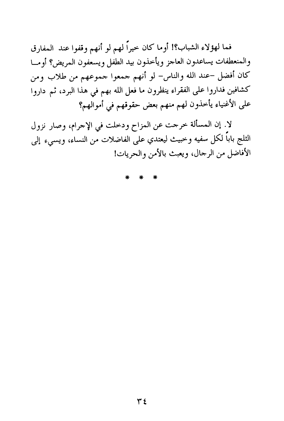 لا. إن المسألة خرجت عن المزاح ودخلت في الإجرام، وصار نزول الثلج باباً لكل سفيه وخبيث ليعتدي على الفاضلات من النساء، ويسيء إلى الأفاضل من الرجال، ويعبث بالأمن والحريات!