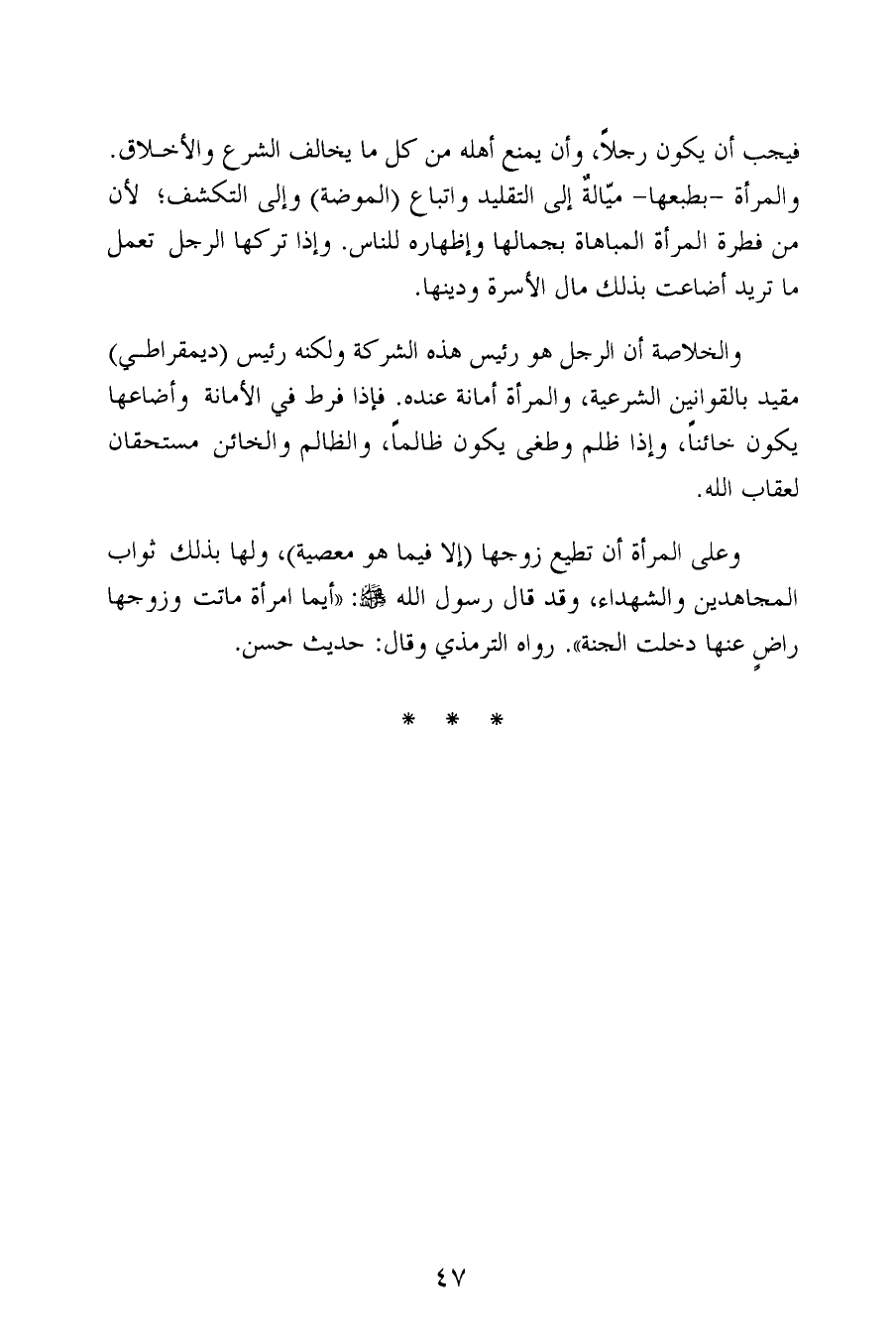 والخلاصة أن الرجل هو رئيس هذه الشركة ولكنه رئيس (ديمقراطي) مقيد بالقوانين الشرعية، والمرأة أمانة عنده. فإذا فرط في الأمانة وأضاعها يكون خائناً، وإذا ظلم وطغى يكون ظالماً، والظالم والخائن مستحقان لعقاب الله.