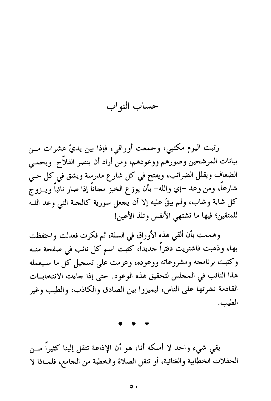 وهممت بأن ألقي هذه الأوراق في السلة، ثم فكرت فعدلت واحتفظت بها، وذهبت فاشتريت دفتراً جديداً، كتبت اسم كل نائب في صفحة منه وكتبت برنامجه ومشروعاته ووعوده، وعزمت على تسجيل كل ما سيعمله هذا النائب في المجلس لتحقيق هذه الوعود. حتى إذا جاءت الانتخابات القادمة نشرتها على الناس، ليميزوا بين الصادق والكاذب، والطيب وغير الطيب.