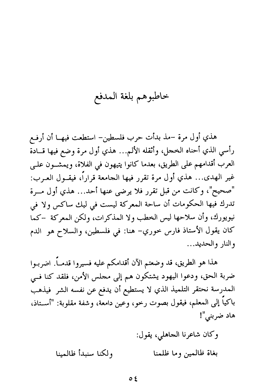 هذا هو الطريق، قد وضعتم الآن أقدامكم عليه فسيروا قدماً. اضربوا ضربة الحق، ودعوا اليهود يشتكون هم إلى مجلس الأمن، فلقد كنا في المدرسة نحتقر التلميذ الذي لا يستطيع أن يدفع عن نفسه الشر فيذهب باكياً إلى المعلم، فيقول بصوت رخو، وعين دامعة، وشفة مقلوبة: "أستاذ، هاد ضربني"!