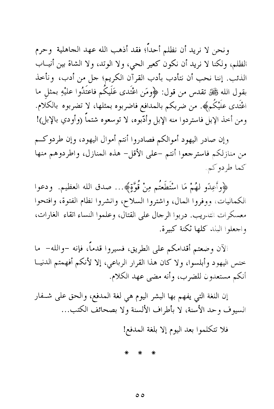 ونحن لا نريد أن نظلم أحداً؛ فقد أذهب الله عهد الجاهلية وحرم الظلم، ولكنا لا نريد أن نكون كعير الحي، ولا الوتد، ولا الشاة بين أنياب الذئب. إننا نحب أن نتأدب بأدب القرآن الكريم؛ جل من أدب، ونأخذ بقول الله عز وجل تقدس من قول: {ومَن اعْتَدى عَلَيكُم فاعتَدُوا عليْهِ بمثلِ ما اعْتَدى علَيْكُم}. من ضربكم بالمدافع فاضربوه بمثلها، لا تضربوه بالكلام. ومن أخذ الإبل فاستردوا منه الإبل وأدّبوه، لا توسعوه شتماً (وأودي بالابل)!