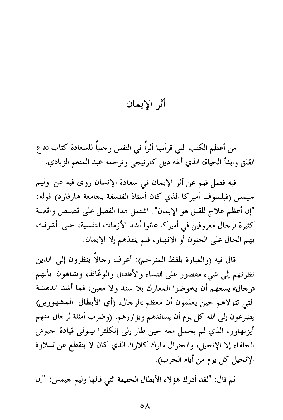 فيه فصل قيم عن أثر الإيمان في سعادة الإنسان روى فيه عن وليم جيمس (فيلسوف أميركا الذي كان أستاذ الفلسفة بجامعة هارفارد) قوله: "إن أعظم علاج للقلق هو الإيمان". اشتمل هذا الفصل على قصص واقعية كثيرة لرجال معروفين في أميركا عانوا أشد الأزمات النفسية، حتى أشرفت بهم الحال على الجنون أو الانهيار، فلم ينقذهم إلا الإيمان.