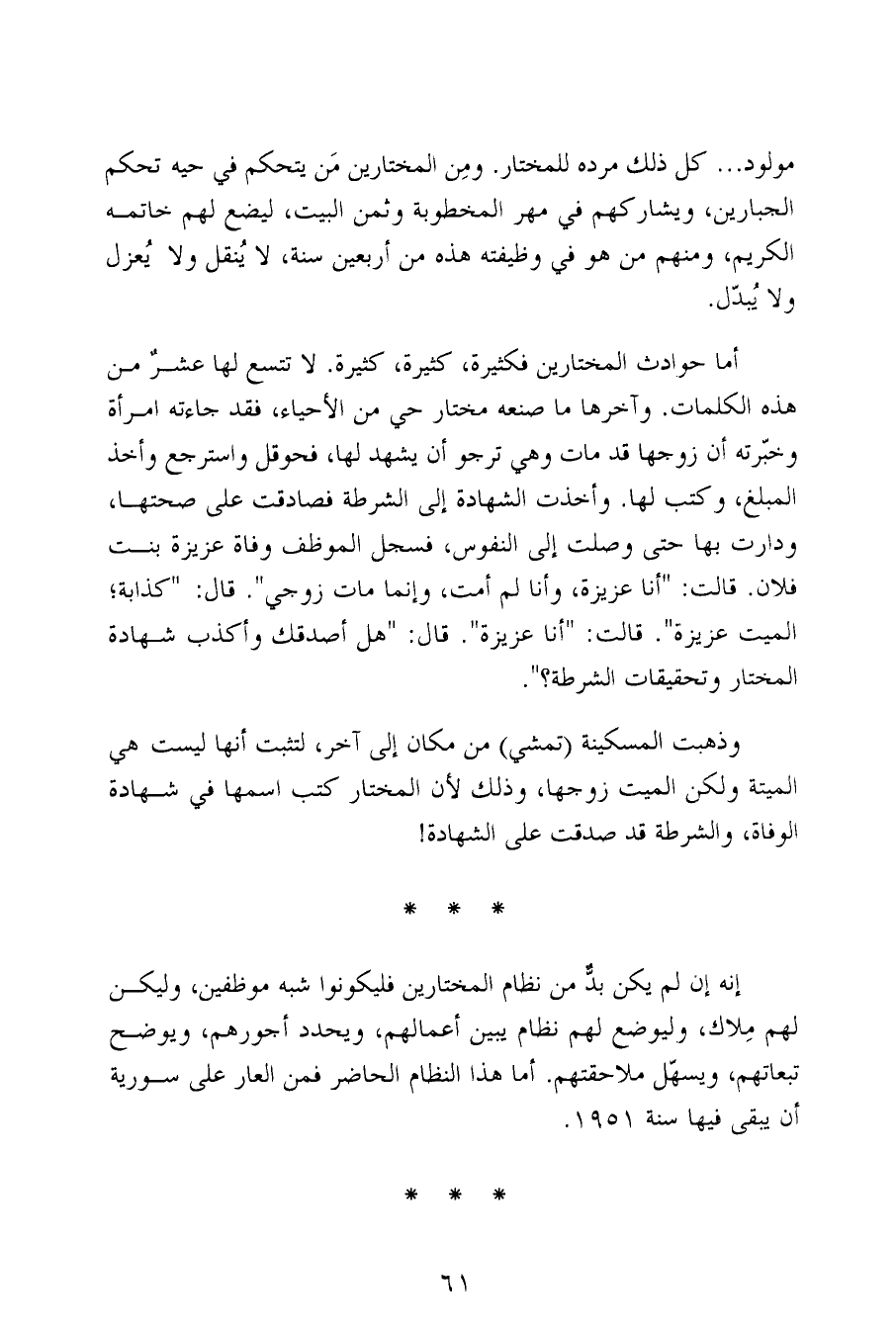 أما حوادث المختارين فكثيرة، كثيرة، كثيرة. لا تتسع لها عشرٌ من هذه الكلمات. وآخرها ما صنعه مختار حي من الأحياء، فقد جاءته امرأة وخبّرته أن زوجها قد مات وهي ترجو أن يشهد لها، فحوقل واسترجع وأخذ المبلغ، وكتب لها. وأخذت الشهادة إلى الشرطة فصادقت على صحتها، ودارت بها حتى وصلت إلى النفوس، فسجل الموظف وفاة عزيزة بنت فلان. قالت: "أنا عزيزة، وأنا لم أمت، وإنما مات زوجي". قال: "كذابة؛ الميت عزيزة". قالت: "أنا عزيزة". قال: "هل أصدقك وأكذب شهادة المختار وتحقيقات الشرطة؟ ".