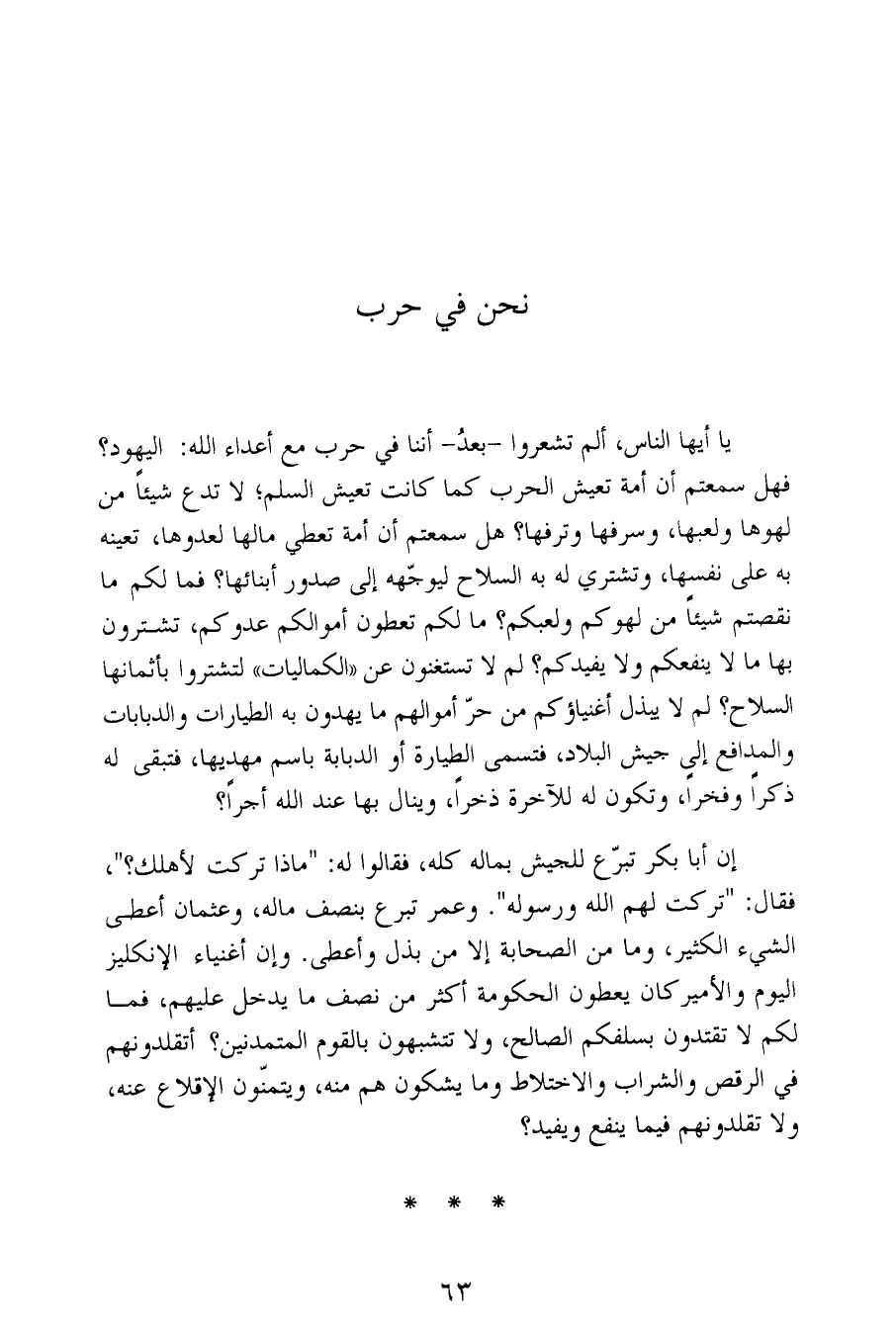 يا أيها الناس، ألم تشعروا -بعدُ- أننا في حرب مع أعداء الله: اليهود؟ فهل سمعتم أن أمة تعيش الحرب كما كانت تعيش السلم؛ لا تدع شيئاً من لهوها ولعبها، وسرفها وترفها؟ هل سمعتم أن أمة تعطي مالها لعدوها، تعينه به على نفسها، وتشتري له به السلاح ليوجّهه إلى صدور أبنائها؟ فما لكم ما نقصتم شيئاً من لهوكم ولعبكم؟ ما لكم تعطون أموالكم عدوكم، تشترون بها ما لا ينفعكم ولا يفيدكم؟ لم لا تستغنون عن «الكماليات» لتشتروا بأثمانها السلاح؟ لم لا يبذل أغنياؤكم من حرّ أموالهم ما يهدون به الطيارات والدبابات والمدافع إلى جيش البلاد، فتسمى الطيارة أو الدبابة باسم مهديها، فتبقى له ذكراً وفخراً، وتكون له للآخرة ذخراً، وينال بها عند الله أجراً؟