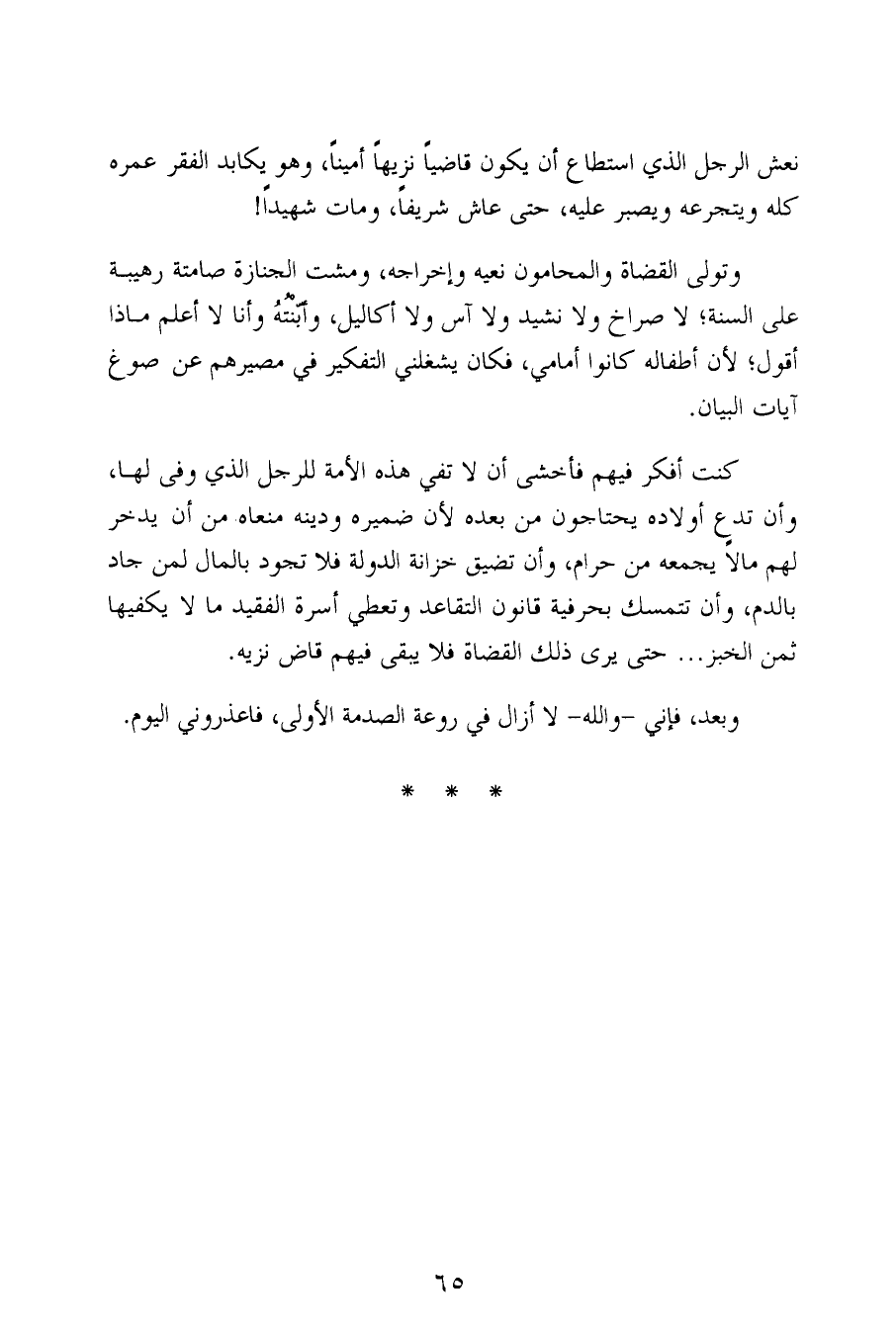 كنت أفكر فيهم فأخشى أن لا تفي هذه الأمة للرجل الذي وفى لها، وأن تدع أولاده يحتاجون من بعده لأن ضميره ودينه منعاه من أن يدخر لهم مالاً يجمعه من حرام، وأن تضيق خزانة الدولة فلا تجود بالمال لمن جاد بالدم، وأن تتمسك بحرفية قانون التقاعد وتعطي أسرة الفقيد ما لا يكفيها ثمن الخبز ... حتى يرى ذلك القضاة فلا يبقى فيهم قاض نزيه.