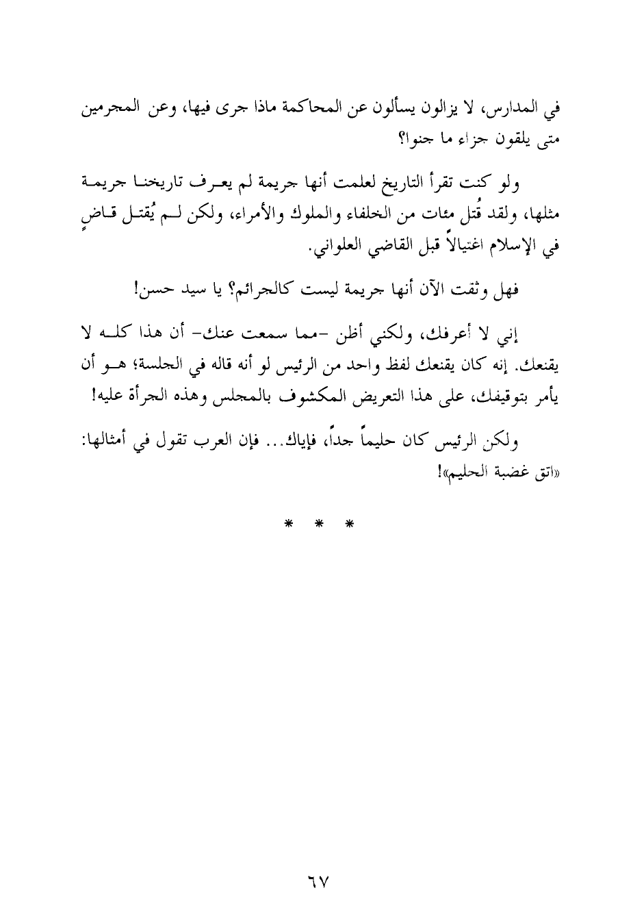 ولو كنت تقرأ التاريخ لعلمت أنها جريمة لم يعرف تاريخنا جريمة مثلها، ولقد قُتل مئات من الخلفاء والملوك والأمراء، ولكن لم يُقتل قاضٍ في الإسلام اغتيالاً قبل القاضي العلواني.