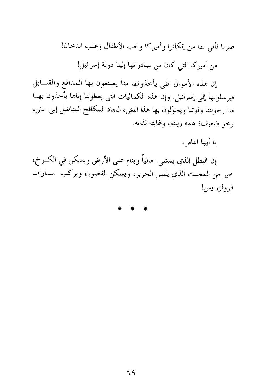 إن هذه الأموال التي يأخذونها منا يصنعون بها المدافع والقنابل فيرسلونها إلى إسرائيل. وإن هذه الكماليات التي يعطوننا إياها يأخذون بها منا رجولتنا وقوتنا ويحوّلون بها هذا النشء الجاد المكافح المناضل إلى نشء رخو ضعيف؛ همه زينته، وغايته لذاته.