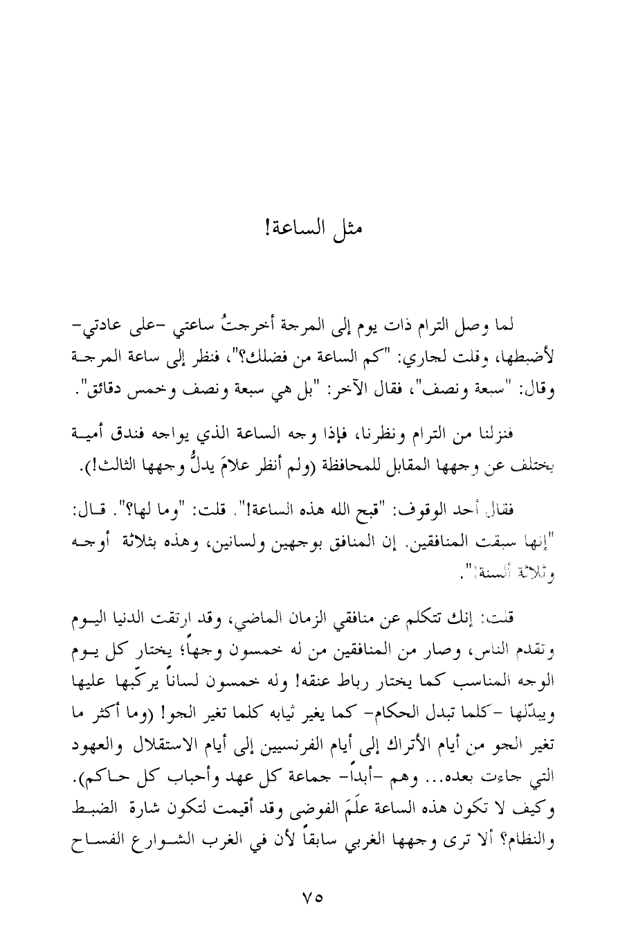 قلت: إنك تتكلم عن منافقي الزمان الماضي، وقد ارتقت الدنيا اليوم وتقدم الناس، وصار من المنافقين من له خمسون وجهاً؛ يختار كل يوم الوجه المناسب كما يختار رباط عنقه! وله خمسون لساناً يركّبها عليها ويبدّلها -كلما تبدل الحكام- كما يغير ثيابه كلما تغير الجو! (وما أكثر ما تغير الجو من أيام الأتراك إلى أيام الفرنسيين إلى أيام الاستقلال والعهود التي جاءت بعده ... وهم -أبداً- جماعة كل عهد وأحباب كل حاكم). وكيف لا تكون هذه الساعة علَمَ الفوضى وقد أقيمت لتكون شارة الضبط والنظام؟ ألا ترى وجهها الغربي سابقاً لأن في الغرب الشوارع الفساح