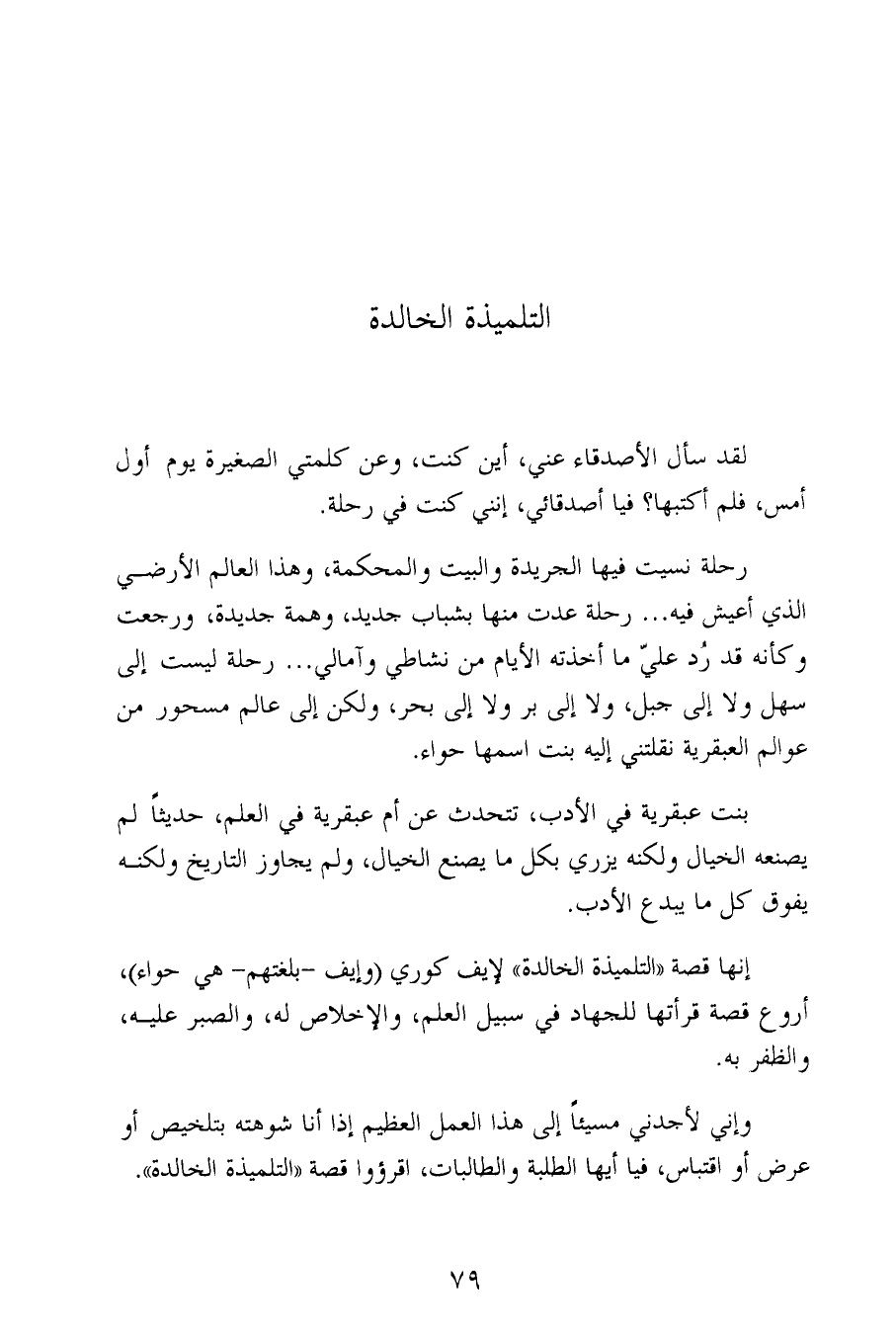 وإني لأجدني مسيئاً إلى هذا العمل العظيم إذا أنا شوهته بتلخيص أو عرض أو اقتباس، فيا أيها الطلبة والطالبات، اقرؤوا قصة «التلميذة الخالدة».