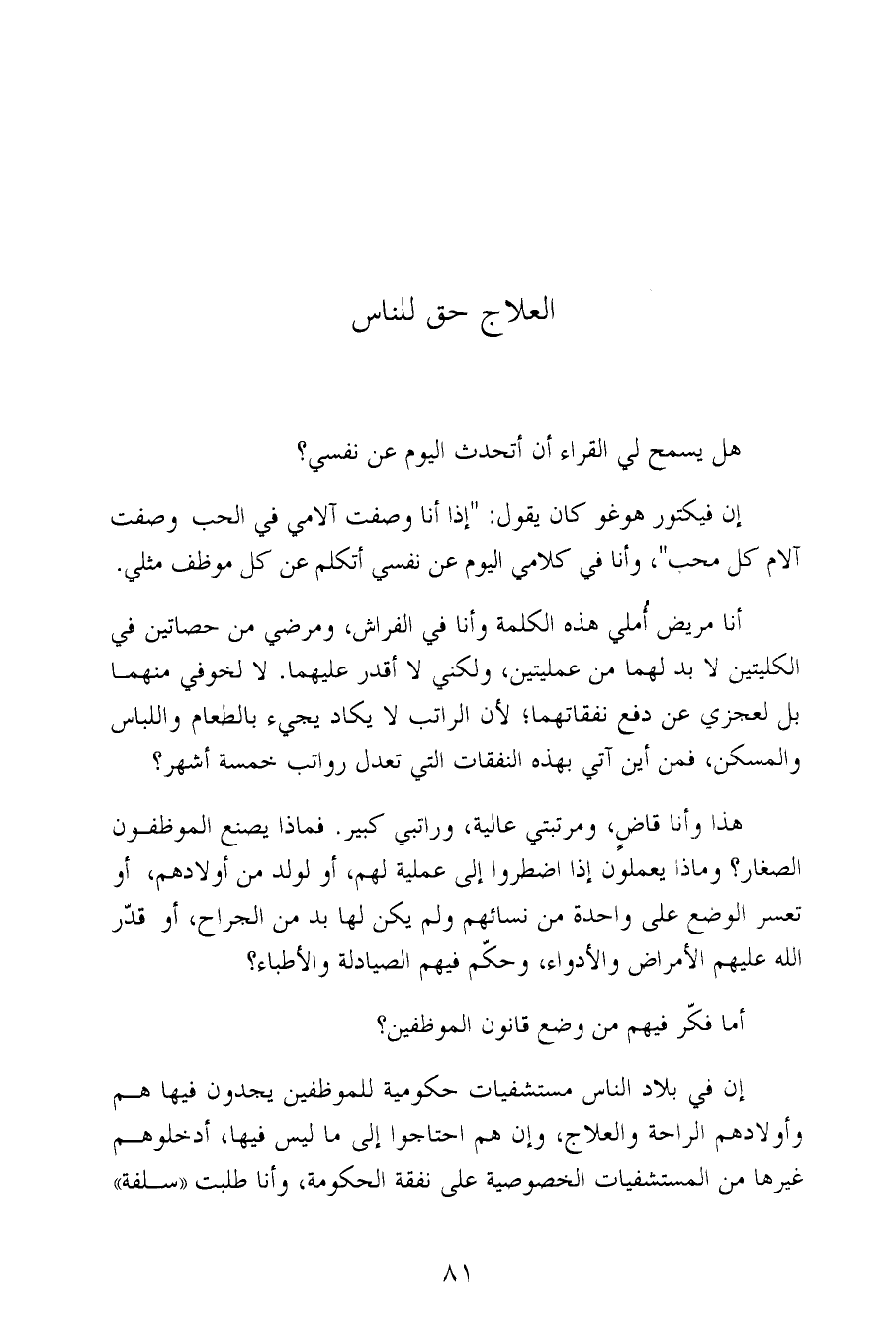 إن في بلاد الناس مستشفيات حكومية للموظفين يجدون فيها هم وأولادهم الراحة والعلاج، وإن هم احتاجوا إلى ما ليس فيها، أدخلوهم غيرها من المستشفيات الخصوصية على نفقة الحكومة، وأنا طلبت «سلفة»