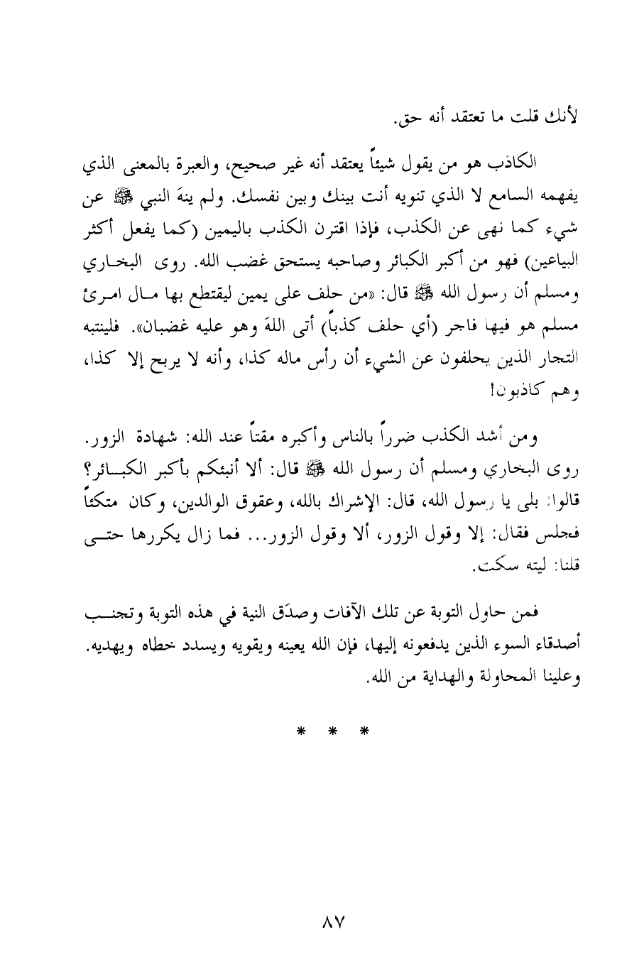 الكاذب هو من يقول شيئاً يعتقد أنه غير صحيح، والعبرة بالمعنى الذي يفهمه السامع لا الذي تنويه أنت بينك وبين نفسك. ولم ينهَ النبي صلى الله عليه وسلم عن شيء كما نهى عن الكذب، فإذا اقترن الكذب باليمين (كما يفعل أكثر البياعين) فهو من أكبر الكبائر وصاحبه يستحق غضب الله. روى البخاري ومسلم أن رسول الله صلى الله عليه وسلم قال: «من حلف على يمين ليقتطع بها مال امرئ مسلم هو فيها فاجر (أي حلف كذباً) أتى اللهَ وهو عليه غضبان». فلينتبه والتجار الذين يحلفون عن الشيء أن رأس ماله كذا، وأنه لا يربح إلا كذا، وهم كاذبون!
