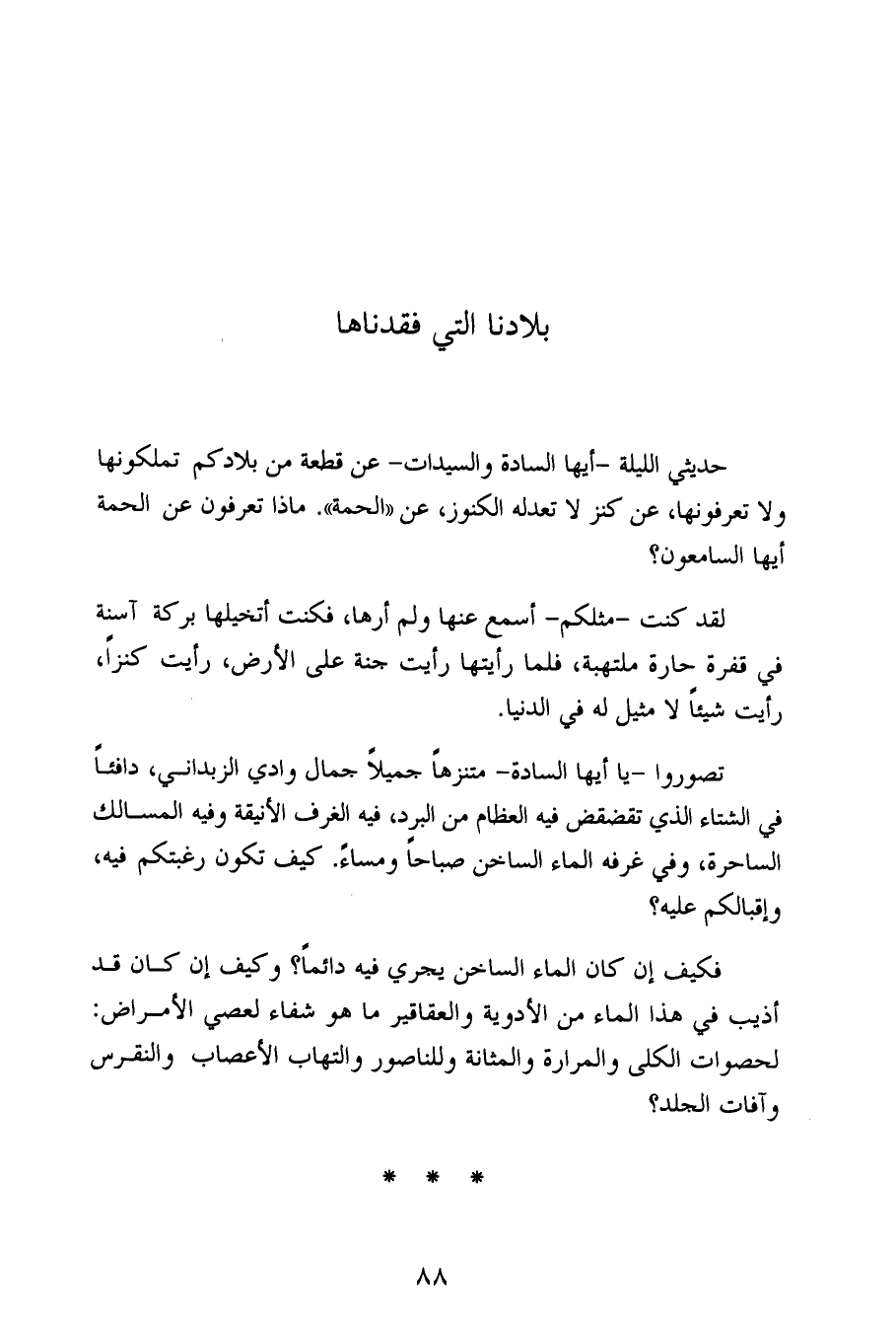 حديثي الليلة -أيها السادة والسيدات- عن قطعة من بلادكم تملكونها ولا تعرفونها، عن كنز لا تعدله الكنوز، عن «الحمة». ماذا تعرفون عن الحمة أيها السامعون؟