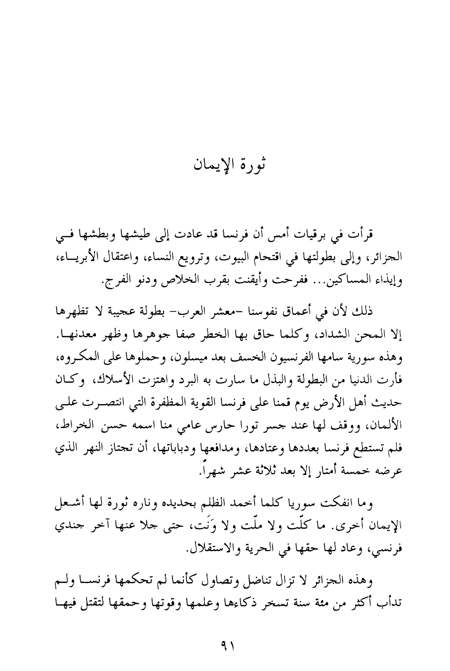 قرأت في برقيات أمس أن فرنسا قد عادت إلى طيشها وبطشها في الجزائر، وإلى بطولتها في اقتحام البيوت، وترويع النساء، واعتقال الأبرياء، وإيذاء المساكين ... ففرحت وأيقنت بقرب الخلاص ودنو الفرج.